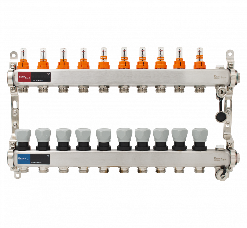Nerezový rozdelovač s prietokomermi, ručným ovzdušňovacím a vypúšťacím ventilom 1"- 10 okruhlový