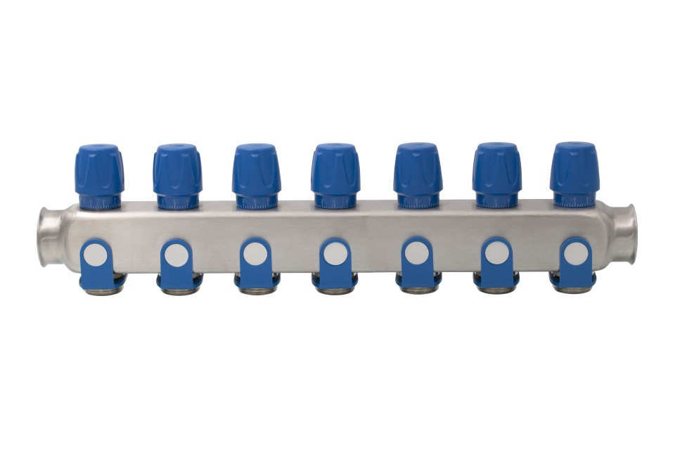 Nerezový rozdelovač 7-cestný s modrým ventilom 1"x3/4"