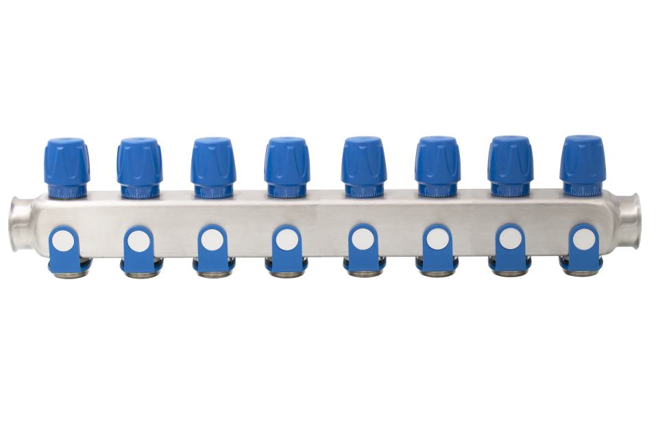 Nerezový rozdelovač 8-cestný s modrým ventilom 1"x3/4"